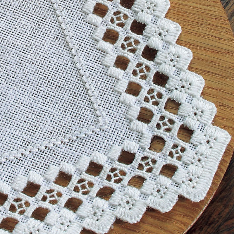 上質のリネンとアブローダー糸で刺すハーダンガー刺しゅう。サテンステッチをした間の織り糸をカットして透かし模様を作ります。