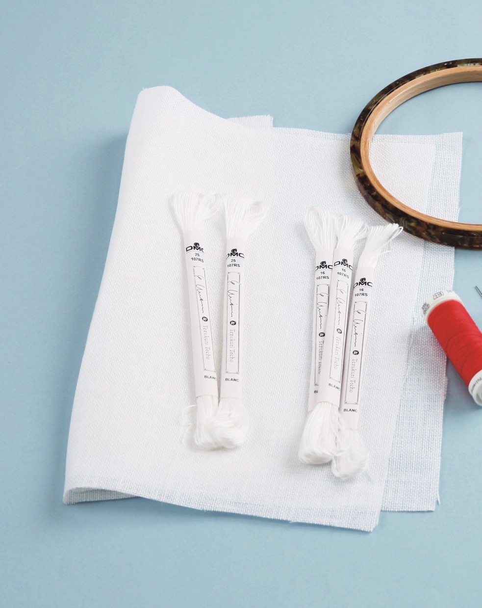 リネン布、オリジナルアブローダー糸=25番×2本、16×3本、クロスステッチ針、作り方説明書