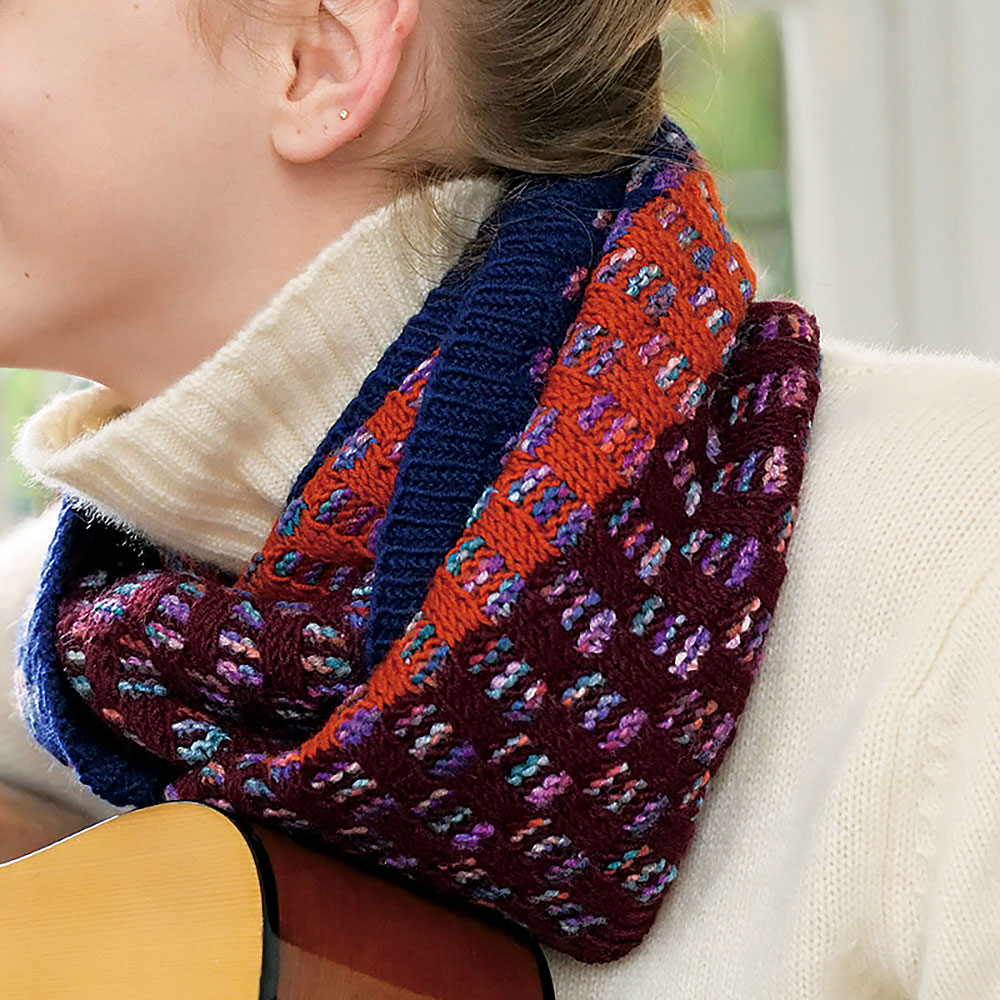 3目おきに3目のすべり目をシンプルに並べて。ソ リッドカラーを3色と段染め糸を組み合わせるこ とで変化を出します。二重に巻けるたっぷりサイ ズのスヌードも、細めの糸で、もたつきません。