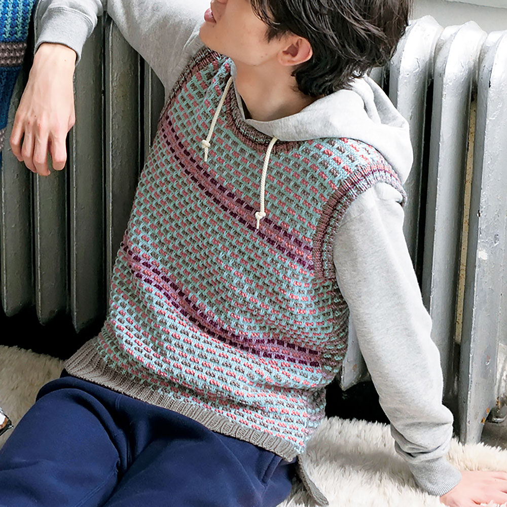 2段ごとの縞模様に3目おきのすべり目を互い違 いに組み合わせて変化をつけています。裏目を 入れることで立体感とニュアンスがプラスされま した。女性にもよく似合う、優しい雰囲気のユニ セックスベストです。