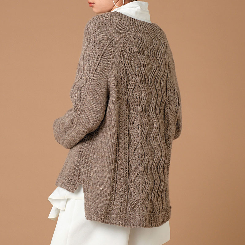 オーバーサイズのラフなシルエットが嬉しいプルオーバー。非対称に配置した、ボッブルの実がついた木の葉を抱くダイヤモンドと、ジグザグ模様を組み合わせたデザインも新鮮です。上部は丸ヨーク状に輪で編んでいるので、ラグラン線の始末は必要ありません。