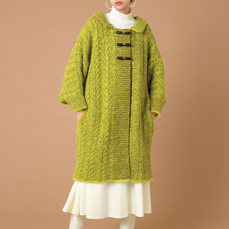 ケーブル模様のきれいな鶸ひわ色のロングコートは、中 に着るものを選ばないゆったりとした着物のような ドルマンスリーブがポイントです。手首裏やポケット 口など、肌が直接あたる部分はふわふわのモヘヤ で編まれていてその肌触りの良さと言ったら…。ヘ ブン体験できること間違いなしです。
