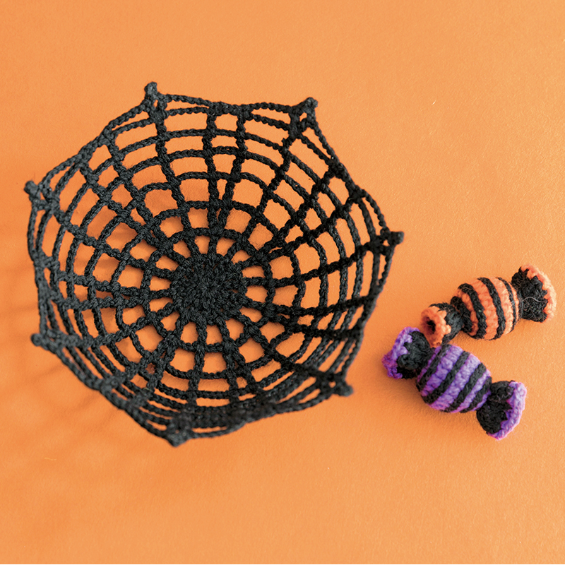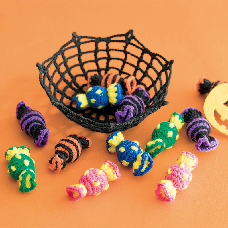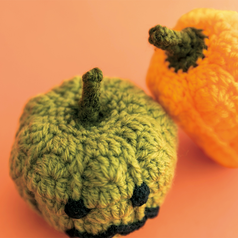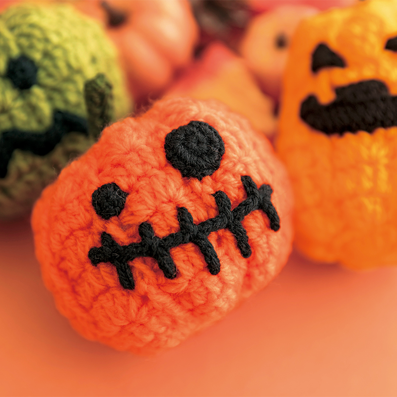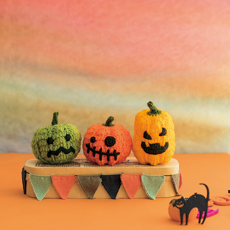 かぼちゃをくりぬいたジャックは魔除け。火を入れるだけでなく、悪霊を追い払うのも 大事な役目です。うんと怖そうな顔に作りましょう! 顔のパーツも黒糸で編んでいます。