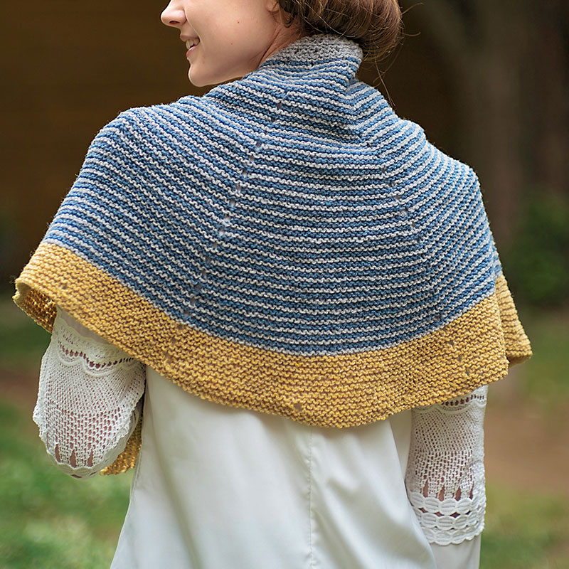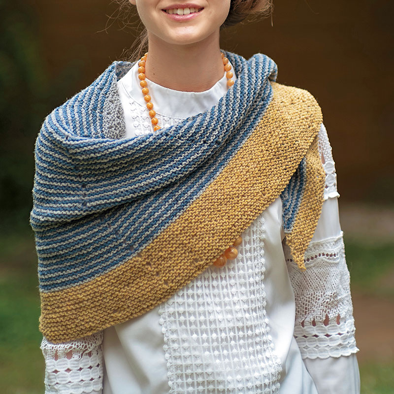 ガーター編みのショールは途中まで規則的なので、編み図を見なくても編み進めら れます。後半のアクセントになる非対称部分は簡単な引き返しで実現。肩から掛け たり、寒いときは首にぐるぐる巻いて。