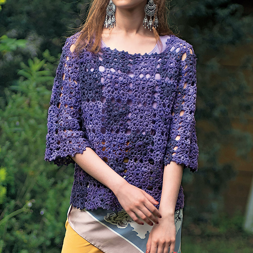 パープルの濃淡で魅せる、四角いモチーフつなぎ。グラデーション糸で編むモチーフは、棒針で編んだり、かぎ針で模様編みを編んだときとは全く違う色の変化が楽しめて、ワクワクします。袖口のモチーフのみ1号太い針で編み、さりげなくベルスリーブに。