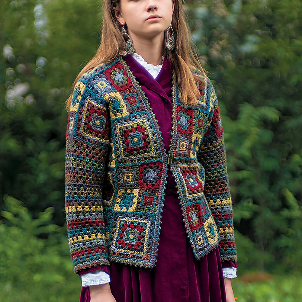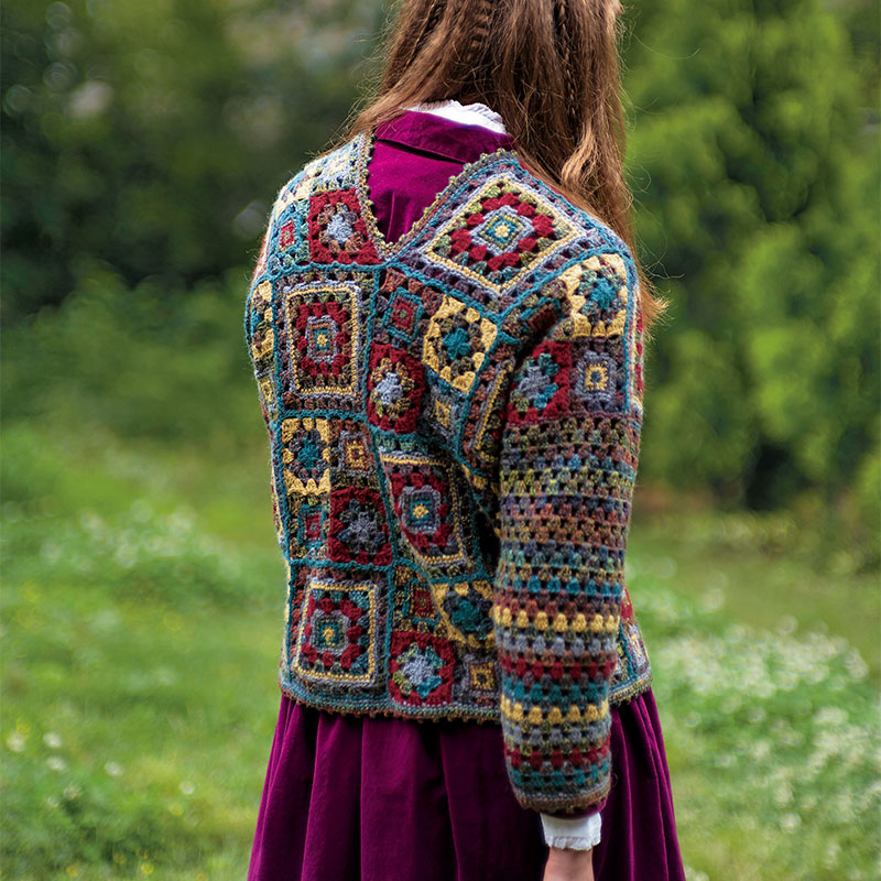 賑やかでいて抑えめの色合いが嬉しい、秋色カーディガン。大小のモチーフをつないだ身頃と、模様編みだけで編んだ袖がベストマッチ! 小モチーフを4枚つなぐと大モチーフの大きさになるので、見た目と違って簡単に、ストレスフリーで編み進められます。