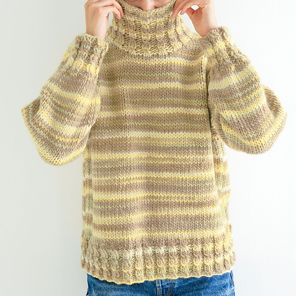 ウールヤーンとカシミヤタッチナイロンのブレンドだから、ふっくら柔らかな肌触り。タートルネックにしても、チクチクする心配はありません。Sodaより少し短め、普通丈のプルオーバーです。