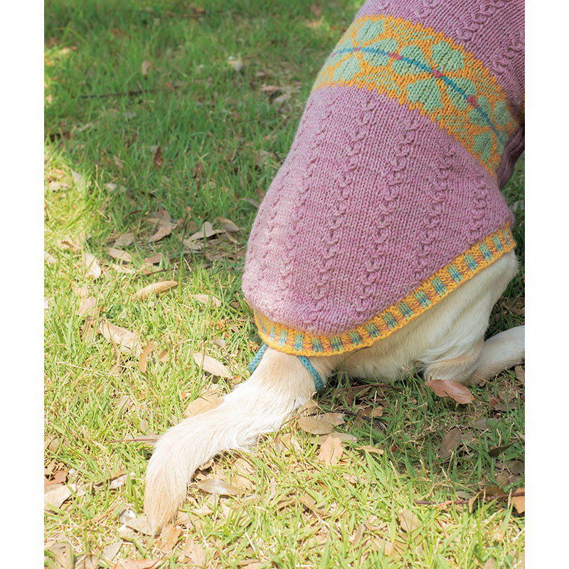 「大型犬のセーターを編みたくても編み図がなくて編めない」との声に応えて、ラブラドールは胸に厚みのある犬種なので、胸の部分は2目ゴム編みで収縮性を出すように考案。ハートが可愛い四つ葉のクローバー模様や色合いが、とても似合っていますね。