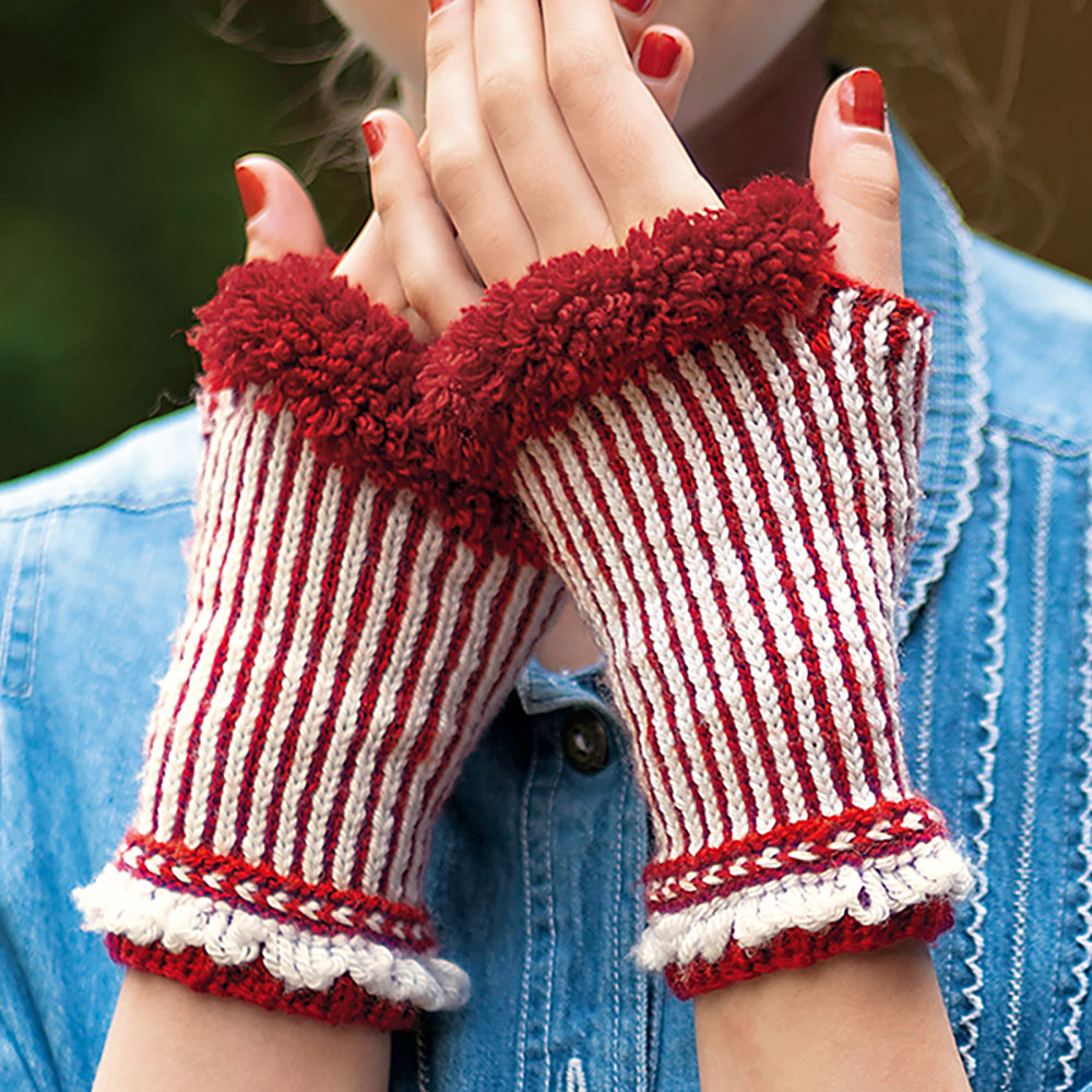 ループ編みとキヒノヴィッツをカフス部分に使って、ちょっと長めの親指つきリストウォーマーにしました。上辺にはボリュームのあるカーヴェルフランスをつけると暖かく、しかもなんだかユーモラスでお出かけが楽しくなりそうです。