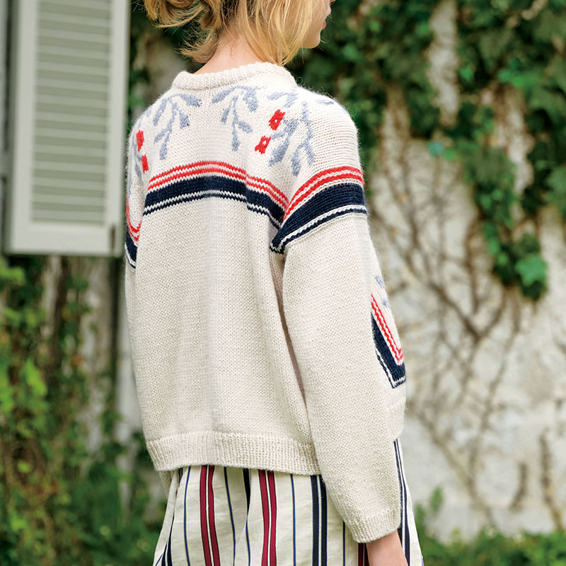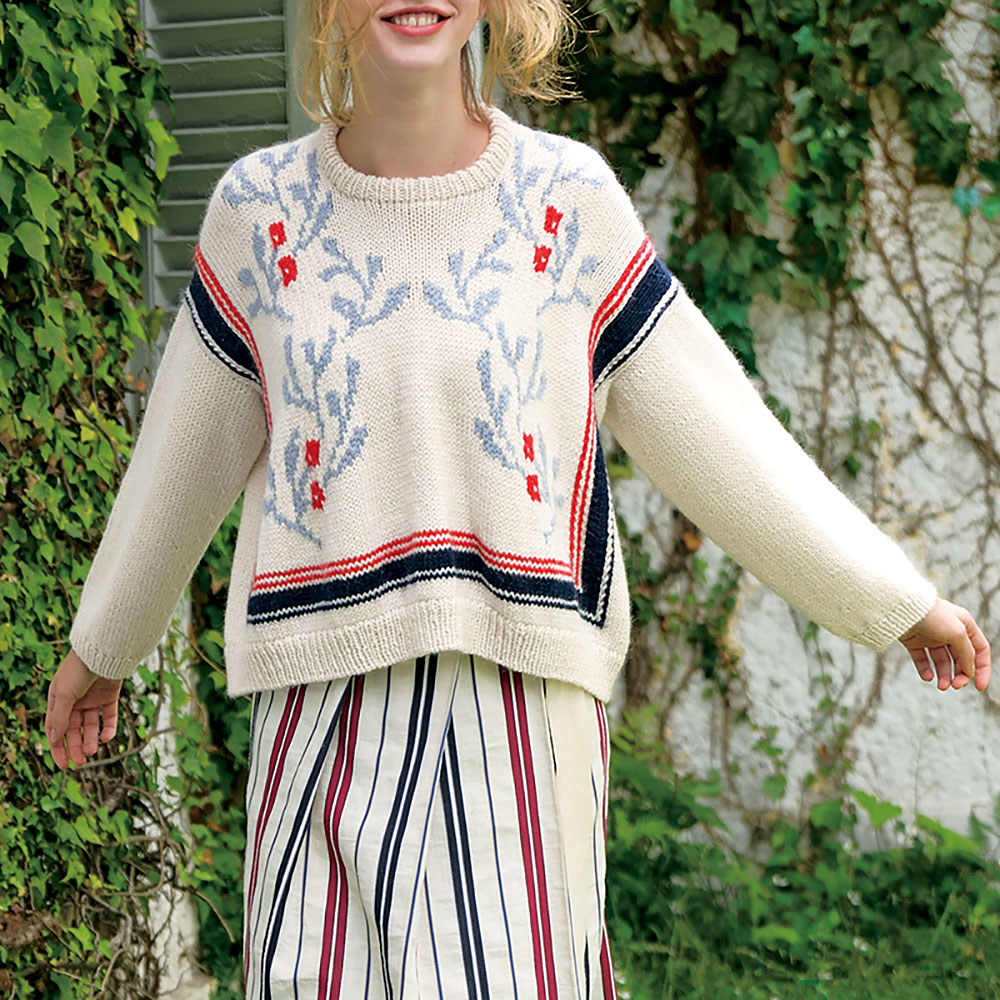 トリコロールカラーのプルオーバーは、素朴なフォークロア風の編み込み模様がチャーミング。続けて大きな長方形に編む前後身頃に衿ぐりの穴をあけて袖をつけた、簡単でユニークな仕立ても注目です。