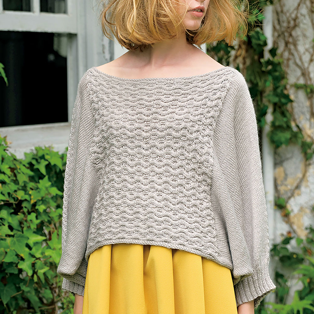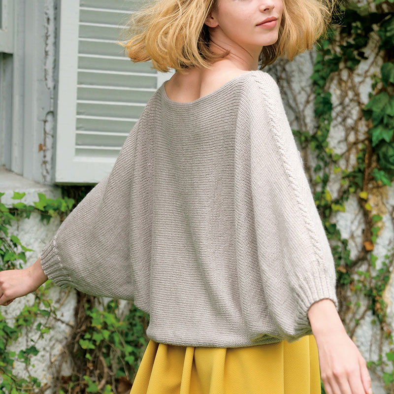 横編みのドルマンスリーブは、ゲージの違うメリヤス編みと模様編みを組み合わせることで、自然なカーブが生まれる技ありのデザイン。ゆったりとした華麗なドレープ、前後差のあるクロップ丈で、パンツに合わせてもバランス良く着こなせます。