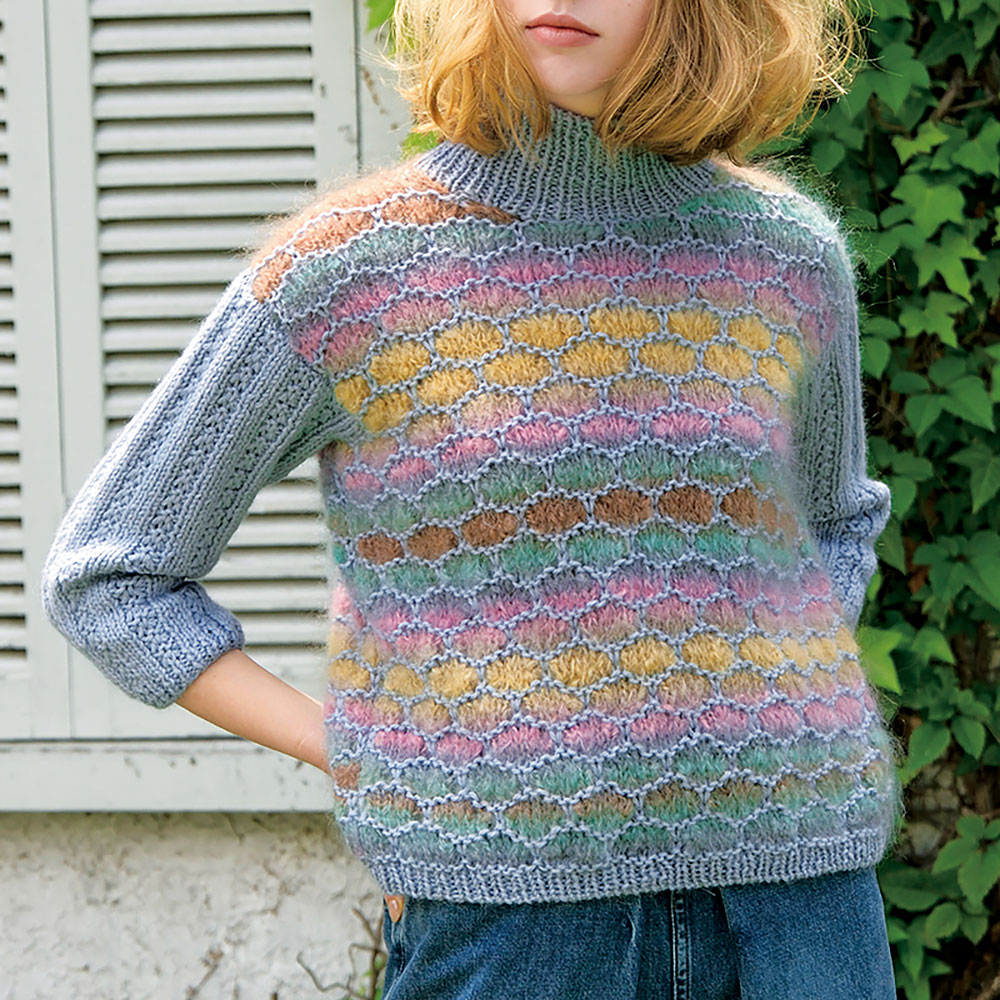 引き上げ編みのハイネックプルオーバーは、単色糸とふわっふわの太い段染め糸との出合いで、ヴィンテージテイストな仕上がりに。懐かしくて新しいスタイルで迎える秋は、ロマンチックな出来事がはじまる予感。