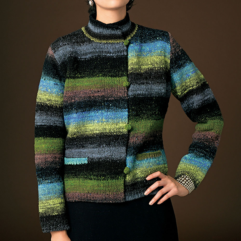 海や空、大地のパワーが感じられるグラデーションヤーンのジャケットは、あえてタイトなゲージで編むことで圧縮ウール地のような表面効果をねらいました。かっちりと編んだきれいなシルエット、シンプルな編み地だからこそ、こだわりのディテールが際立ちます。