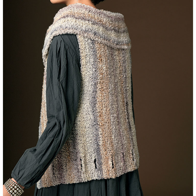 穀物を思わせる粒々ループが可愛らしい糸は、ナチュラルで穏やかなカラーリング。メリヤス編みの前後身頃を一気に横編みで編み上げ、大きなカラーは身頃から拾って編んでいます。パズルのような編み地の構造と、裾に並んだホール模様が個性的で面白いデザインのベストです。