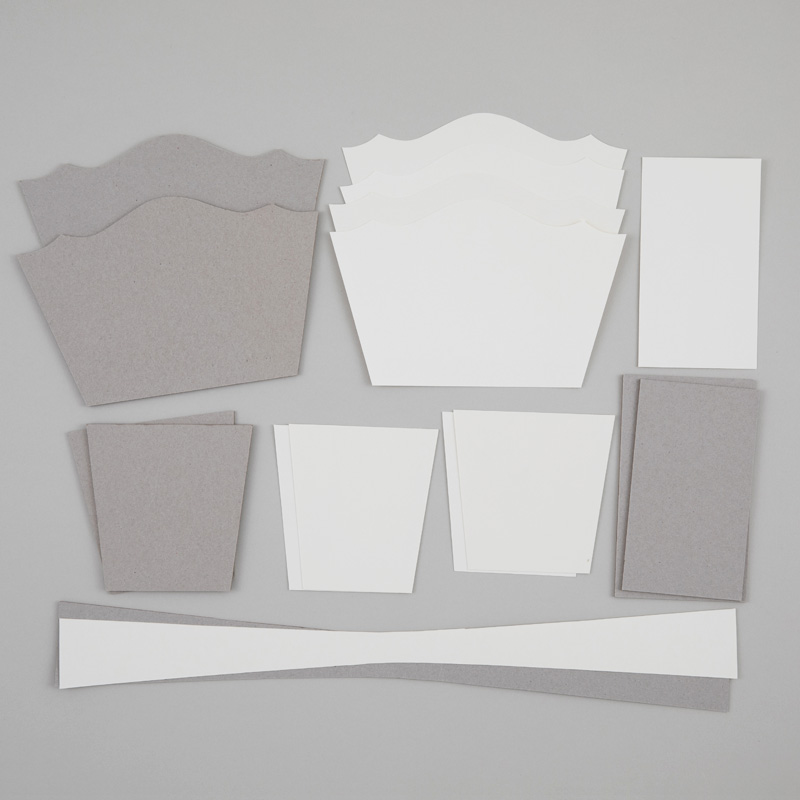 前後面(外)用生地 17.5×25 ㎝ …2 枚 側面(外)用生地 17×15 ㎝…2 枚 持ち手(上)用生地 8×52 ㎝…1枚 台座用生地 12×19 ㎝…1枚 前後面(内)用生地 17×25 ㎝…1枚 側面(内)用生地 14.5×15 ㎝…1枚 内底用生地 12×18 ㎝…1枚 本体表角用生地 15×2.5 ㎝…4 枚 持ち手用生地 9×52 ㎝…1枚