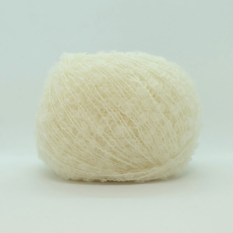 くるくるしたループがかわいいファンシーヤーンです。キッドモヘヤを使用することでループの形状が安定し、柔らかさもあります。ふんわり空気を含むので、軽くて暖か。1本でも編んでいただけますが、引き揃えもおすすめ。