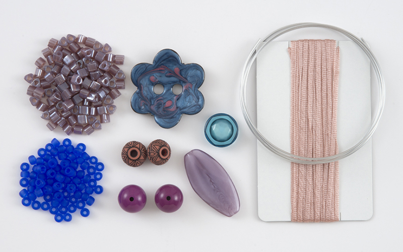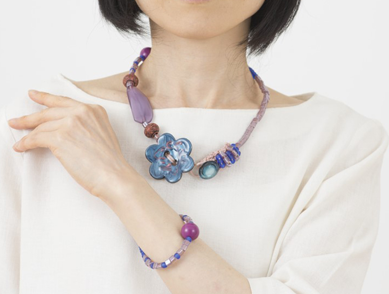 【キット作り方つき】インパクトのある大きな花形や特大ビーズ、カラフルな三角ビーズなどをお好みでワイヤーに通して作るネックレス。ロングタイプか、ショート&ブレスレットを選んで作れます。留める部分は簡単なニット仕立て。