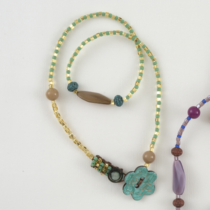 【キット作り方つき】インパクトのある大きな花形や特大ビーズ、カラフルな三角ビーズなどをお好みでワイヤーに通して作るネックレス。ロングタイプか、ショート&ブレスレットを選んで作れます。留める部分は簡単なニット仕立て。