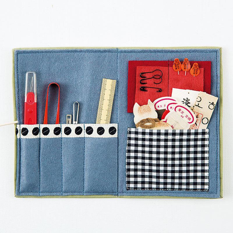 内側は、ドット模様のテープやギンガムチェックをアクセントにポケットや針ホルダーを作ります。