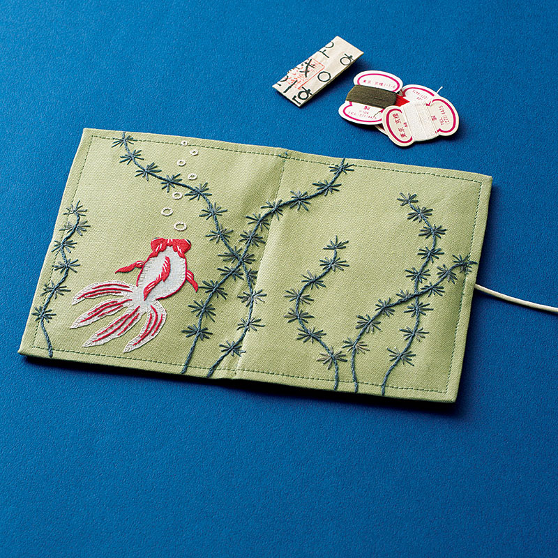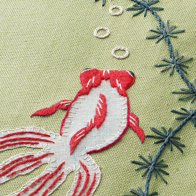 外側には水草の中を優雅に泳ぐ金魚を、アップリケと刺しゅうであしらいます。さまざまな糸やオーガンジーを使って表情豊かに仕上げるのがポイント。