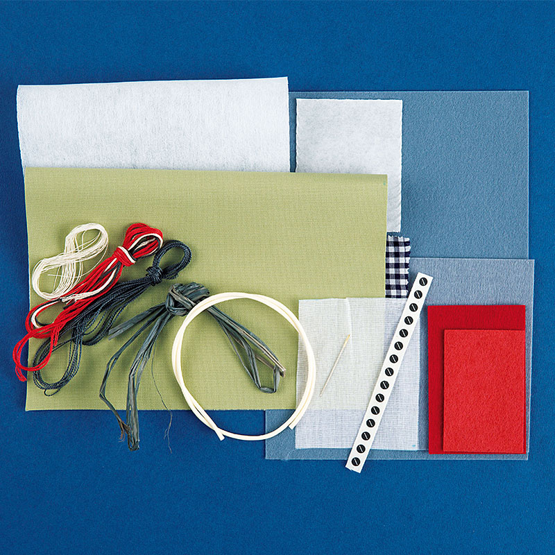 表布、裏布、フェルト×4種、両面接着シート、接着芯、ドットテープ、刺しゅう糸×4種、ミシン糸、ラフィア、ロウビキコード、フランス刺しゅう針、作り方説明書