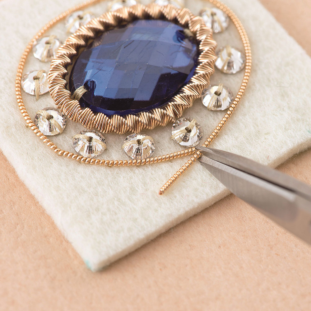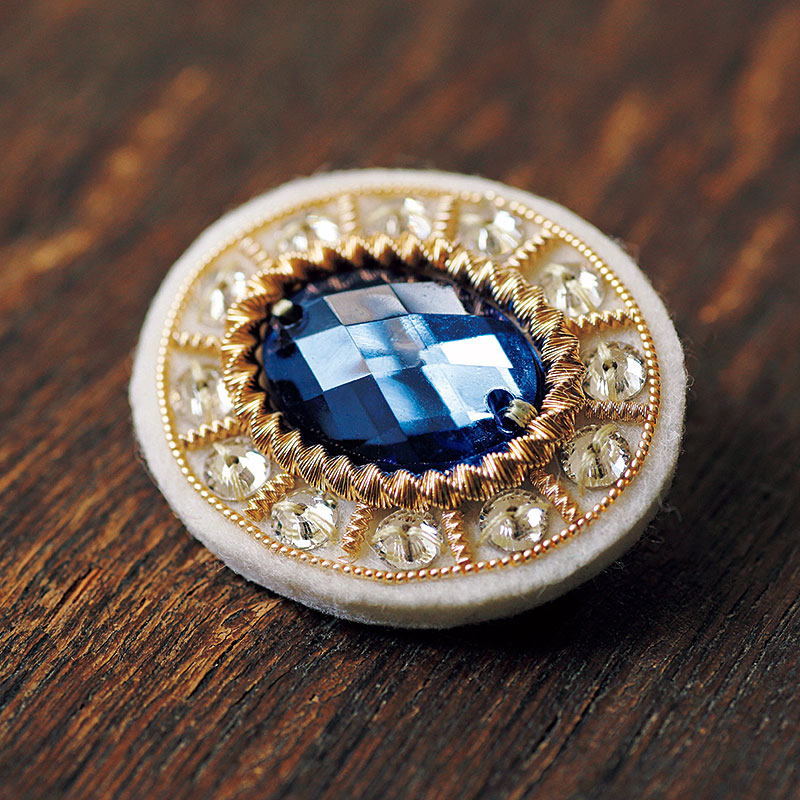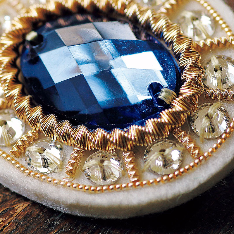 英国王室所蔵のジュエリー「ザ・プリンス・アルバート・ブローチ」にヒントを得たデザインを、笹尾さんがゴールドワークのテクニックで表現しました。サファイア色のアクリル・ビジューと透明な輝きが美しいクリスタルビーズを柔らかなメタル糸3種で囲む、上品なブローチです。