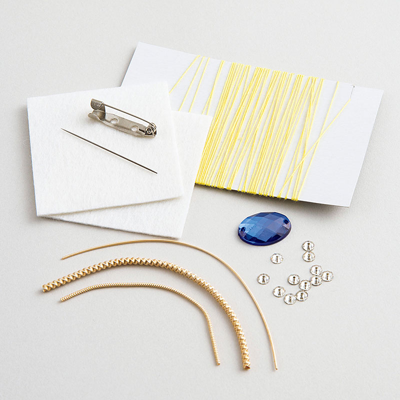 アクリルビーズ=サファイア×1個・スワロフスキー×12個、メタル糸×3種、フェルト×2種、ブローチピン、ミシン糸、縫い針、作り方説明書
