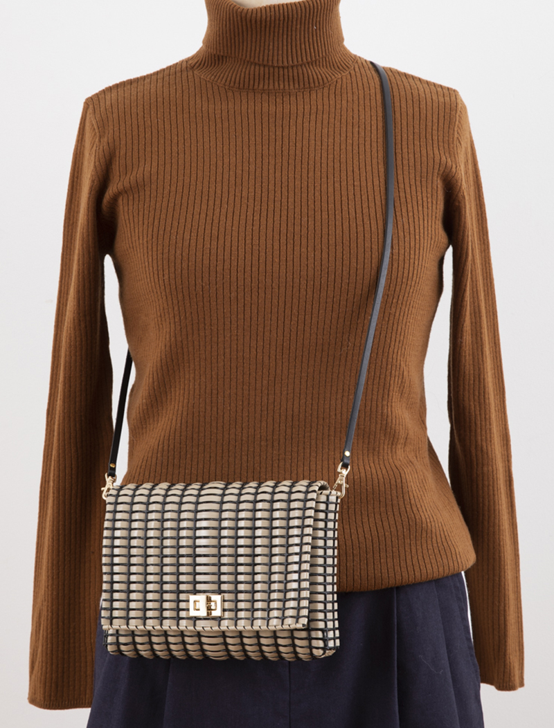 【キット作り方つき】ネット状のベースに、人気のテープ素材を通していくだけの簡単ショルダーです。女性らしいニュアンスある色合い。ナスカンでつける本革ひもが高級感を添えます。