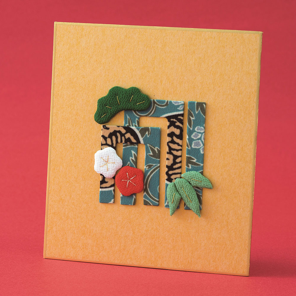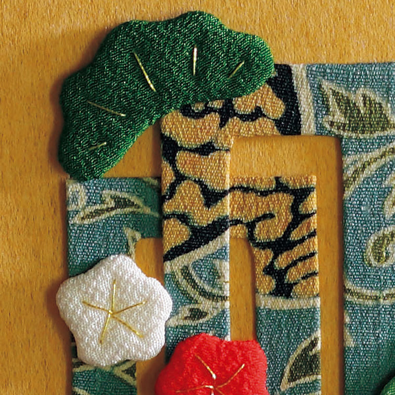 源氏香の中でも”おめでた柄”として有名な「初音」の押絵に、伝統的な押絵の技法で作る松・竹・梅をあしらい、ミニ色紙にまとめます。紙製のスタンドつきなので、お正月や祝いの日に飾ってお楽しみください。