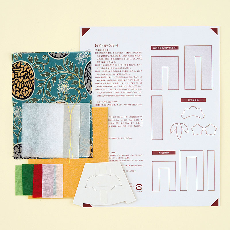プリント縮緬、無地縮緬×4種、金糸、色紙、紙製スタンド、両面接着シート、キルト綿、作り方説明書