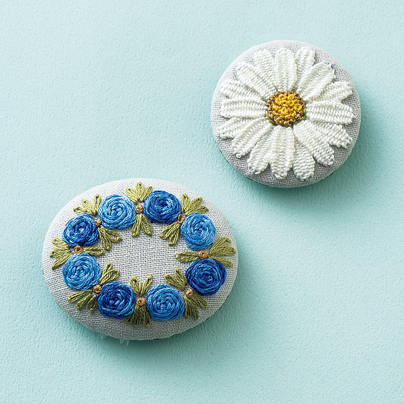 青木和子さんの魅力が凝縮された、ブルーローズの楕円のブローチと、ホワイトデイジーの丸いブローチが1つずつ作れます。