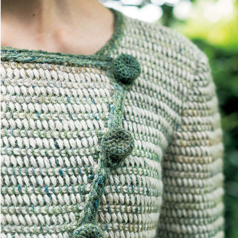 もっともベーシックなプレーンアフガン編みも、糸の太さを変えるだけでちょっと変わった雰囲気になります。組み合わせる糸の太さがかなり違っても大丈夫なのがアフガン編みのいいところ。もどり目を編むときに色を変えるので、くっきりとした縞にならないのもアフガン編みならではの特徴。裏側との表情の違いも楽しんで。