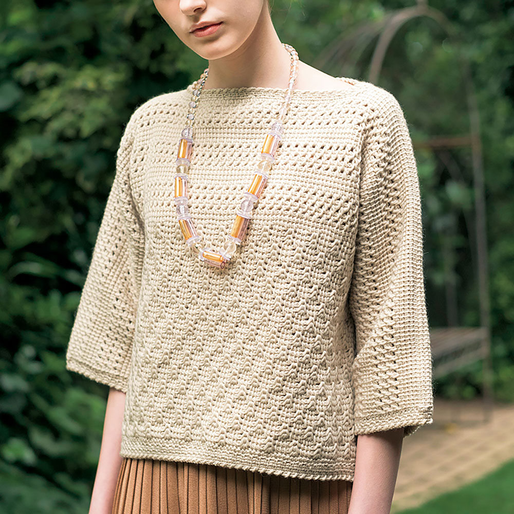 2種類の模様編みを組み合わせたプルオーバーは、陰影の美しさと肌触りの良さが魅力的。ほとんどまっすぐに編むだけなので、模様を編むことに集中できます。付け替え式のアフガン針ならT字形の横長の編み地も編むことができます。