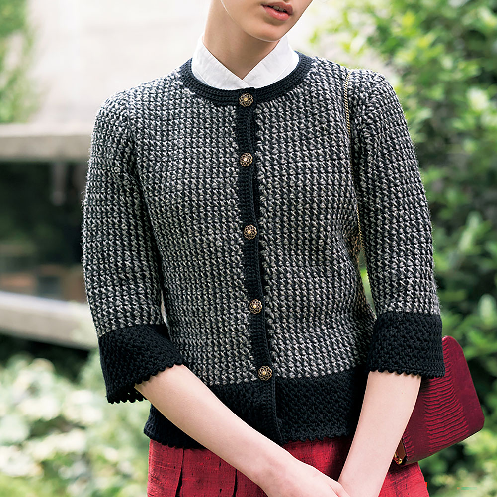 1目の交差できっちり編むことでまるで布地のように仕上がります。カチッとしたジャケットは体に沿ったシルエットできちんとした印象に。ほんのり広がった裾と袖口でフェミニンな雰囲気をプラスします。