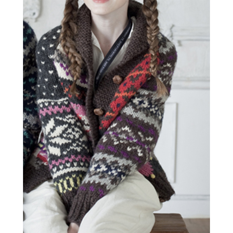 材料:ハマナカ カナディアン 3S スリーエス こげ茶(4)330g/4玉、チャコールグレー(5)180g/2玉、生なり(1)50g/1玉、茶色(3)・赤(13)各30g/各1玉、淡いグレー(2)・ピンク(12)・紫(14)各20g/各1玉、黄(10)・オレンジ色(11)・紺(15)各10g/各1玉。直径25mmのボタン5個。