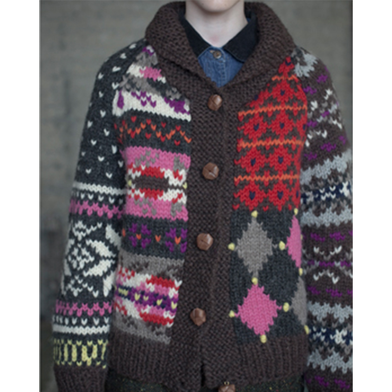 カウチンセーター用に新しく生まれたマテリアル。ナチュラルカラーがほとんどで、あまり見られなかったカラフルなカラー展開にリスペクトされて、英国伝統ニットの模様をパッチワーク風にアレンジ。楽しいコラボニットの完成です。