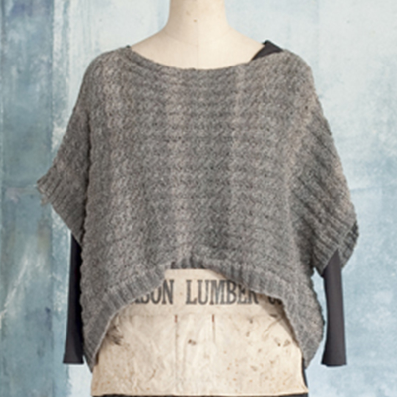 細いブークレの糸にラメの糸をからめ、色が穏やかに変化。糸にドレープ性があるので、ストレートにあけた衿ぐりも、きれいなボートネックになります。細い糸にケーブルをたくさん入れて、裾は前後にカーブをつけ、ポンチョ風プルオーバーにしました。