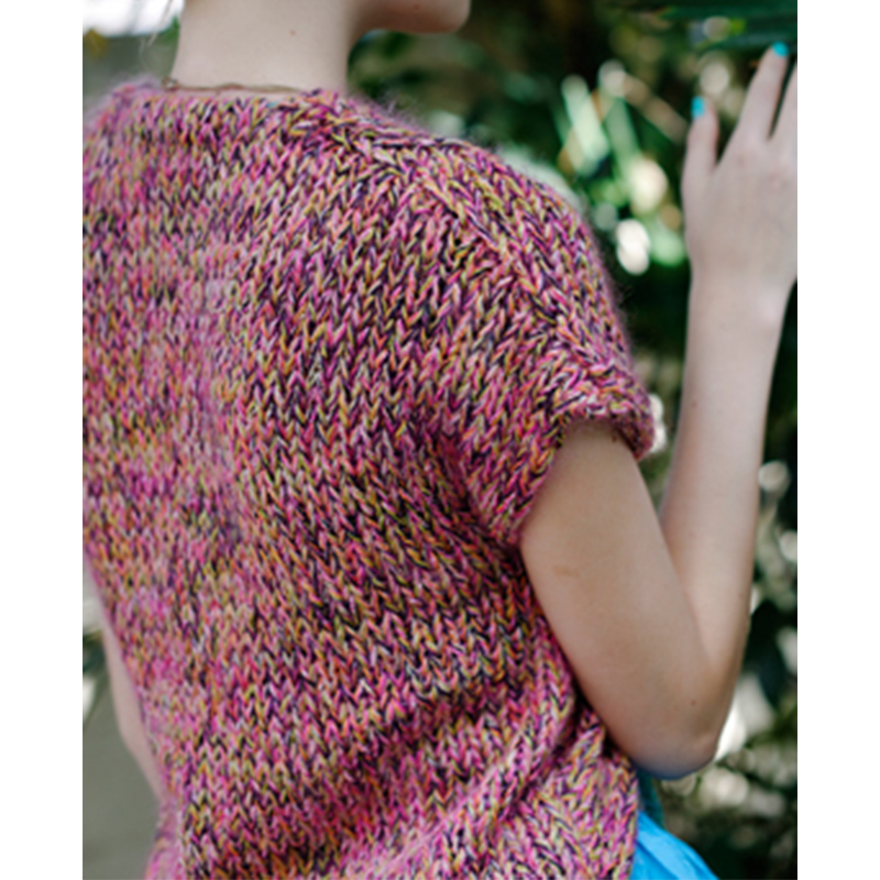 前身頃は、後身頃脇から拾い目をして、横編みにしています。前立て部分に通した編みひもで、前身頃をギューッとシャーリングさせて着るのがおススメです。