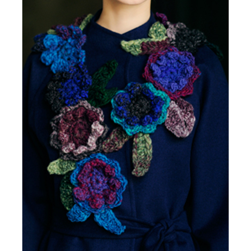 大きな花モチーフの飾りマフラー。太糸なので、4段程度編むだけで1輪が、たった1段で葉っぱが完成します。