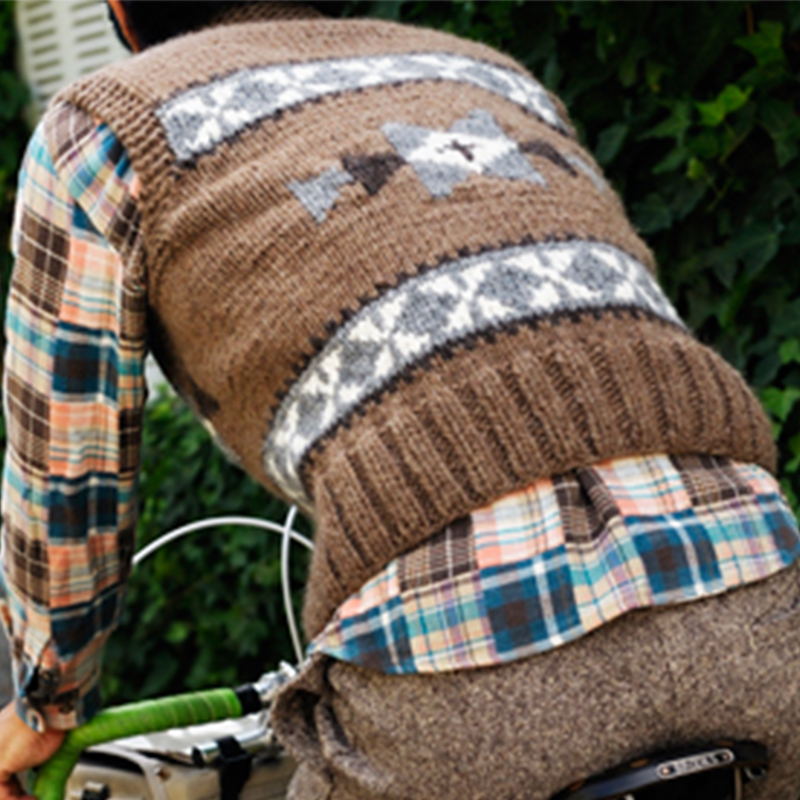ブラウンベースにほっこりとした前開きのニットベストに英国紳士風のニッカポッカパンツで、レトロなツーリング車にマッチ。ちょっとお出かけサイクリングに羽織りたい。