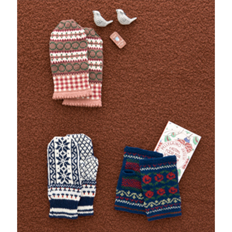 ウエアだと派手すぎても、ミトンならOKというチャレンジができて、柄と柄の組み合わせも合いますよね。いろんな色が使えるところも好き。着るものに比べたら早く編みあがるし、さらに指なしミトンなら、スマホを使うときに便利で、仕上げも早いし、一石二鳥!
