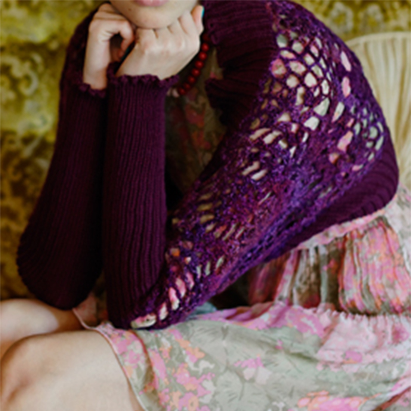 材料:ダイヤモンド毛糸 ダイヤタスマニアンメリノ 紫(721)95g/3玉。ダイヤタスマニアンメリノ<アモーレ> 紫系段染め(805)65g/2玉。