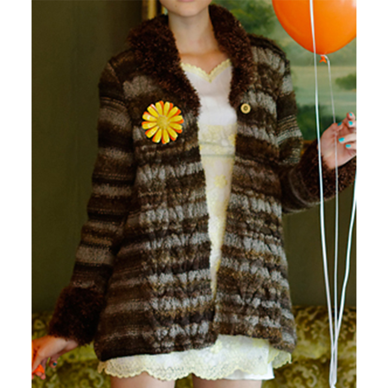 材料:オリムパス手あみ毛糸 クインテット 茶系段染め(9)365g/10玉。シャイニーファー 茶色(6)50g/2玉。直径20mmのボタン1個。