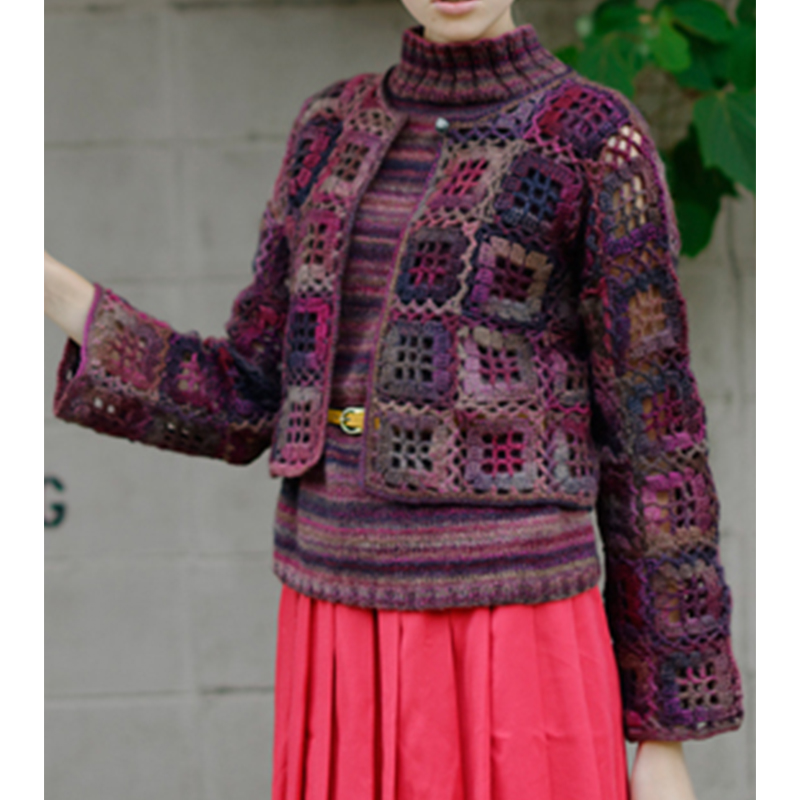 短い長糸で完成するかぎ針編みのモチーフは、段染めの糸の予測不可能な色の出方がおもしろい。メリヤス編みのインナーを合わせてツインにするのも素敵です。