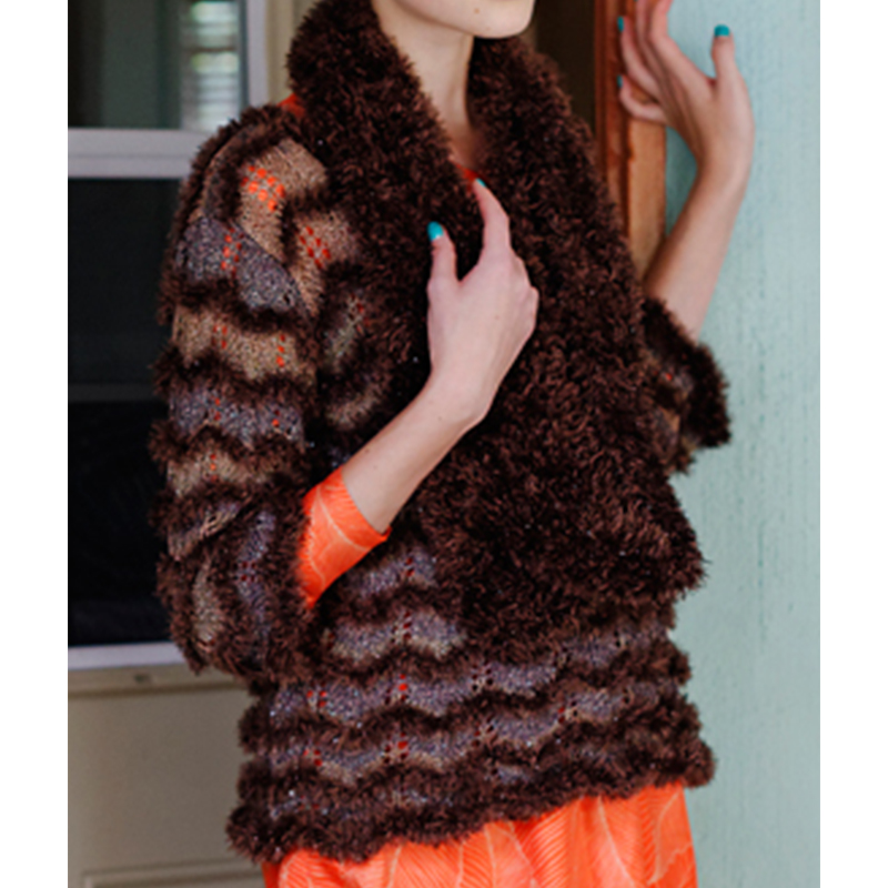 材料:オリムパス手あみ毛糸 [プルオーバー] リュクス 茶系段染め(10)195g/7玉。シャイニーファー こげ茶(6)90g/3玉。 [スヌード] シャイニーファー こげ茶(6)90g/3玉。
