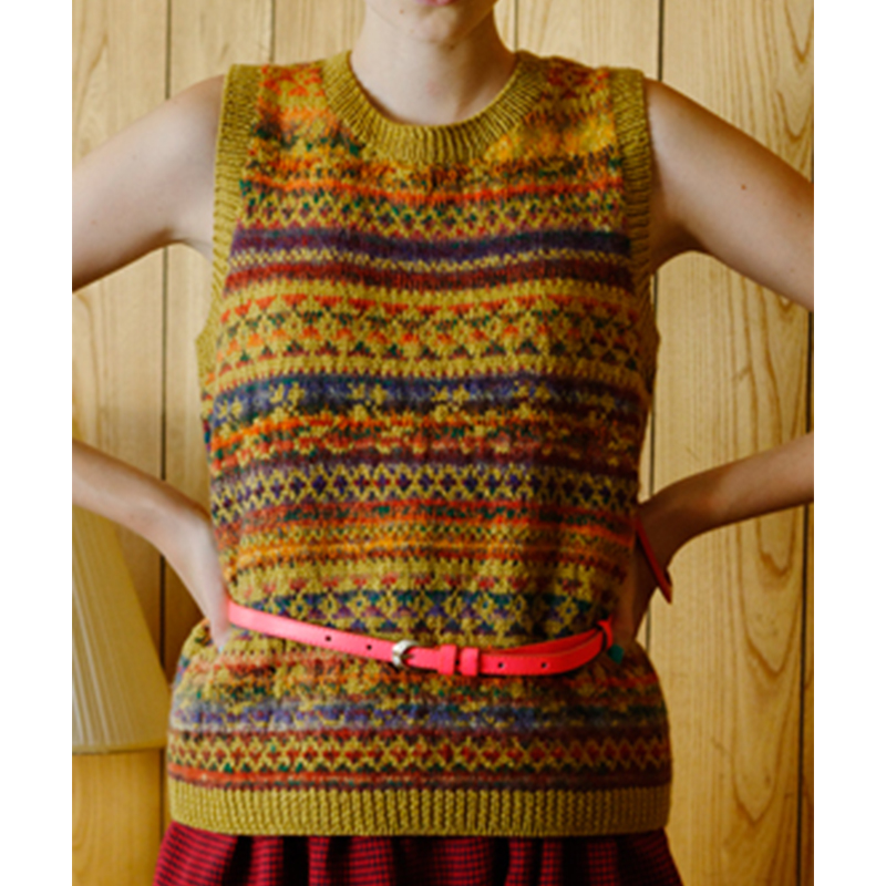 フェアアイルの編み込み模様も、配色糸を段染めにして編むと、印象派の絵画のような仕上がりに。特徴のあるベストは、キャミソールのように着ても可愛い。