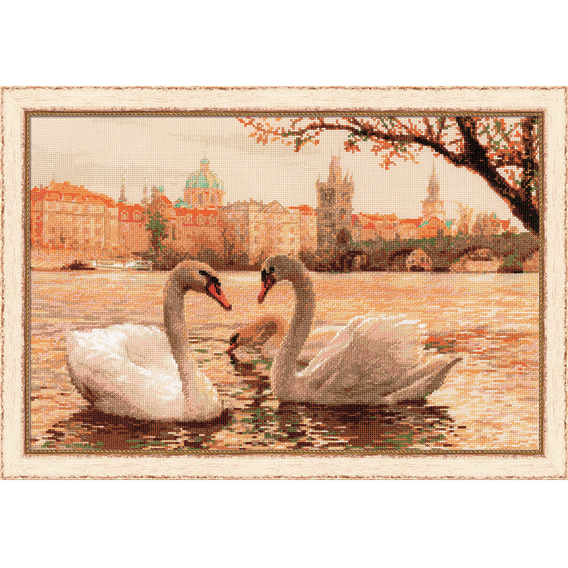 [キット作り方つき]チェコの首都・プラハの街と白鳥の姿を描いた落ち着いた雰囲気のクロスステッチキットです。中級~上級の方向き。リトアニア・RIOLIS社製。