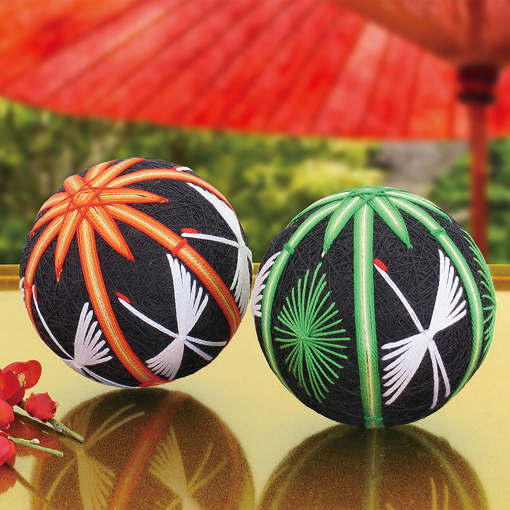 日本に古くから伝わる遊具・手まりは現在、飾りや贈り物として人気。お正月などの縁起物飾りとしておすすめの「朱竹と鶴」「若竹と松」をセットでお届けします。