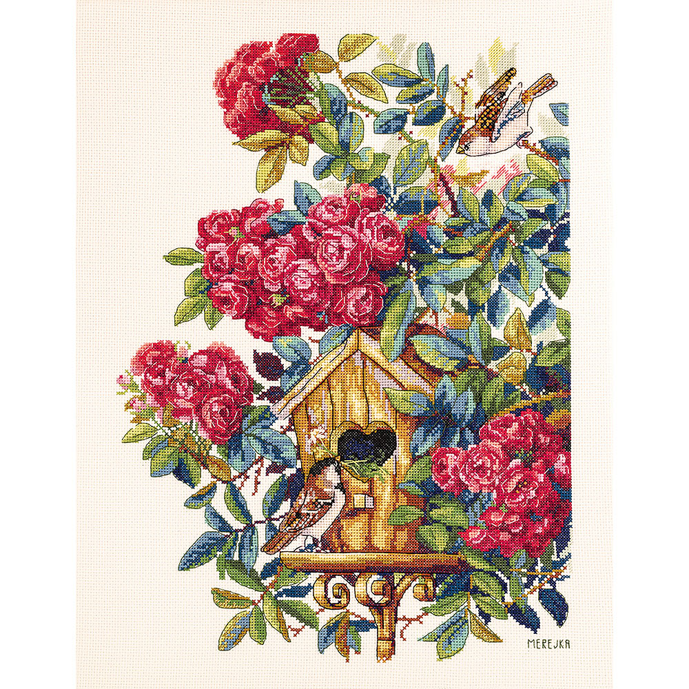 バラの咲くころは鳥の巣作りの季節。バラの茂みの中の鳥小屋を描いたクロスステッチ作品です。上級の方向き。Merejka社製。