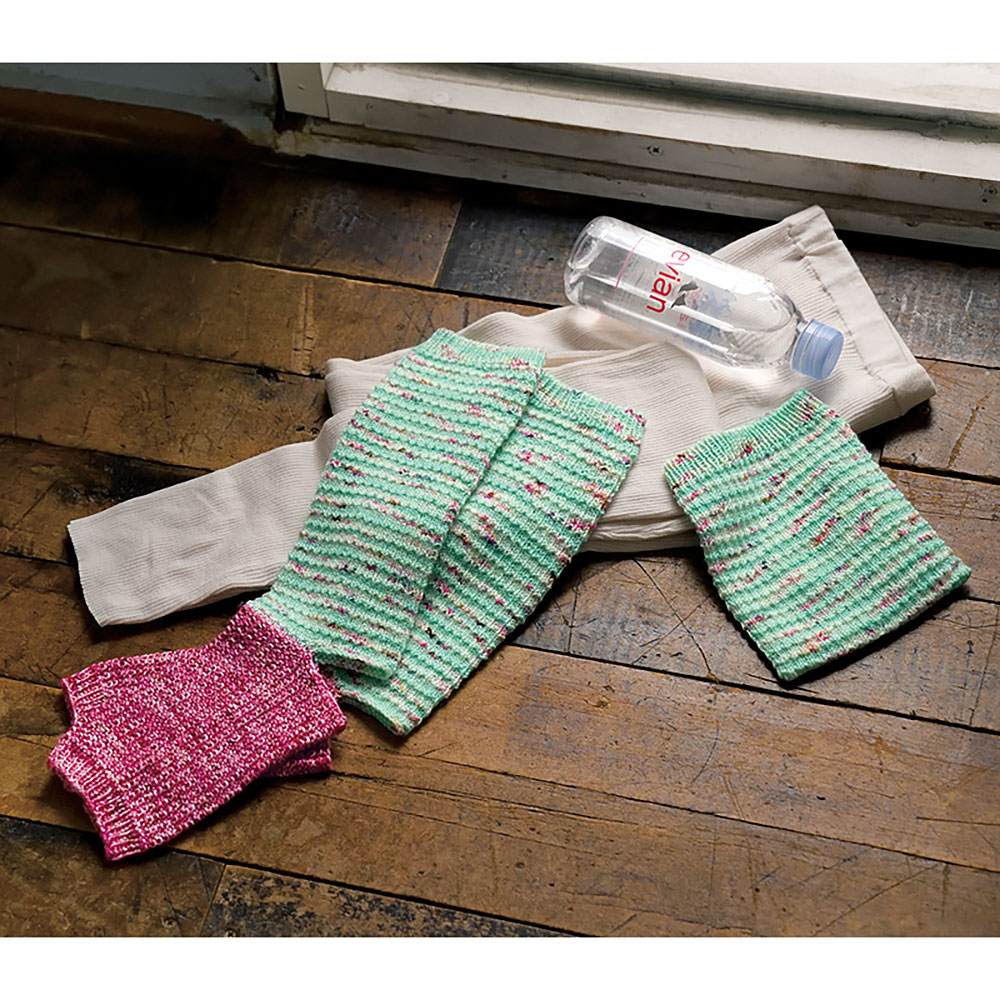 この靴下の編み方がよく分かる、まっすぐに編んだ 部分だけで仕上げたトレンカと、収納ポーチのセッ トです。かかととつま先が出ているので、ヨガのお 供にもぜひ。